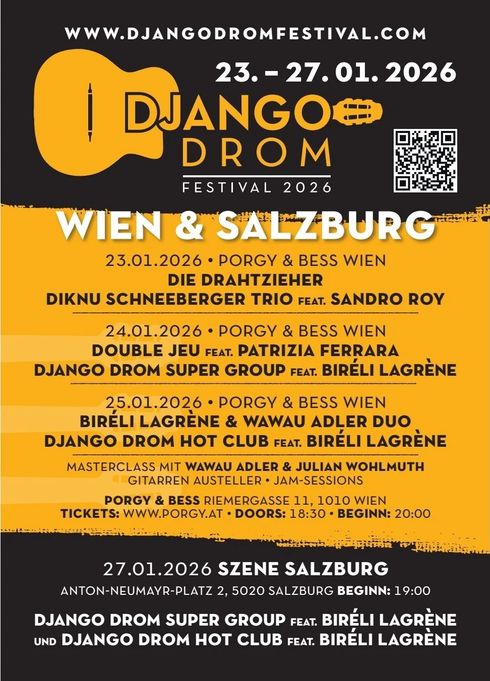23.-25.01.2026, Porgy& Bess Beginn: 20:00 Doors: 19:00 Gitarren Aussteller & Jam-Sessions @ Strenge Kammer: 18:00 Tickets: 1 Tag: 45€ 3 Tage: 105€ www.porgy.at